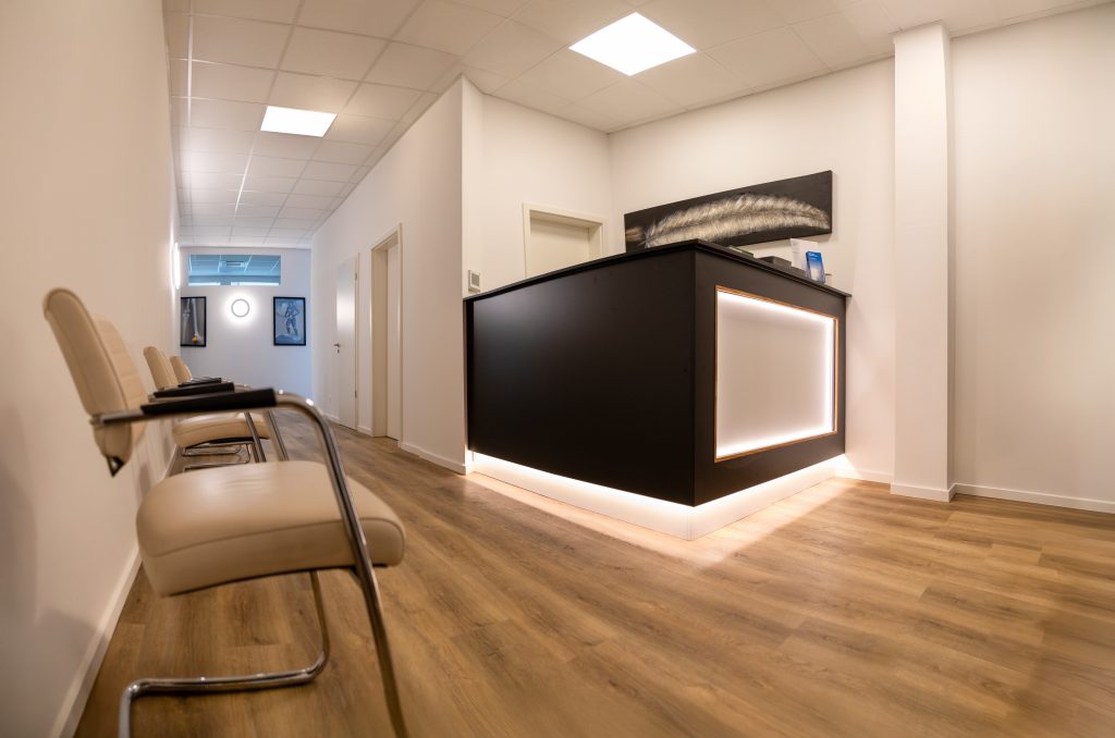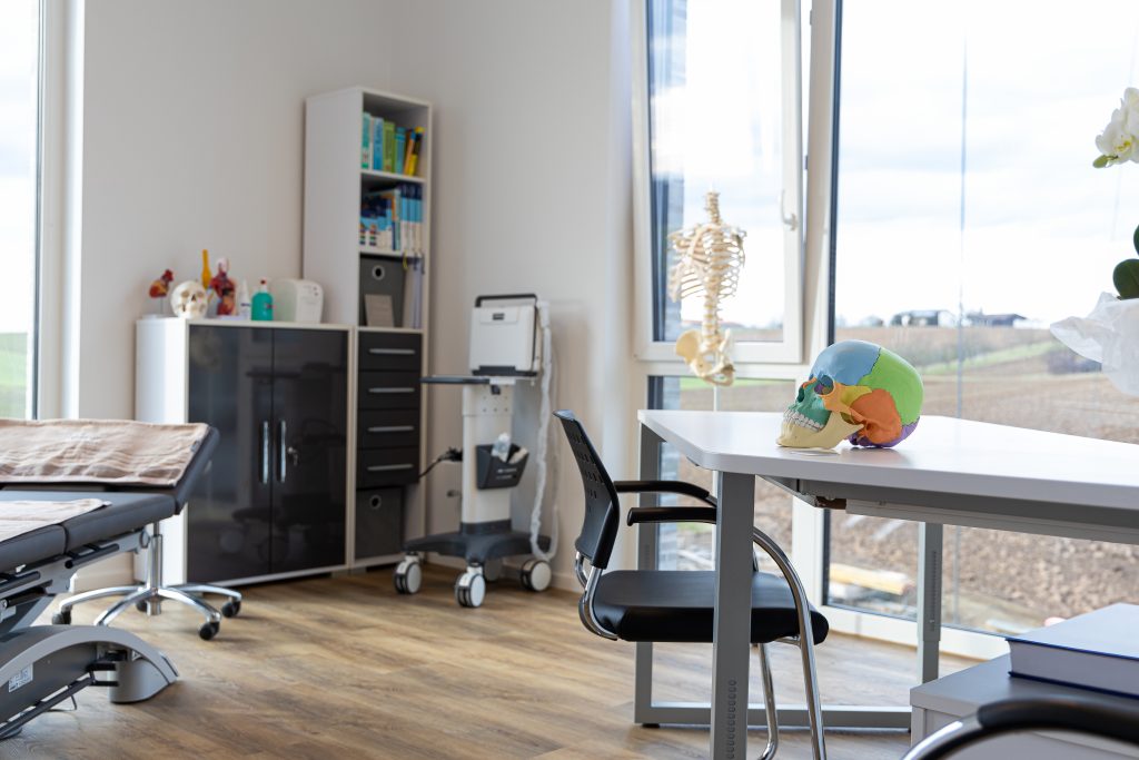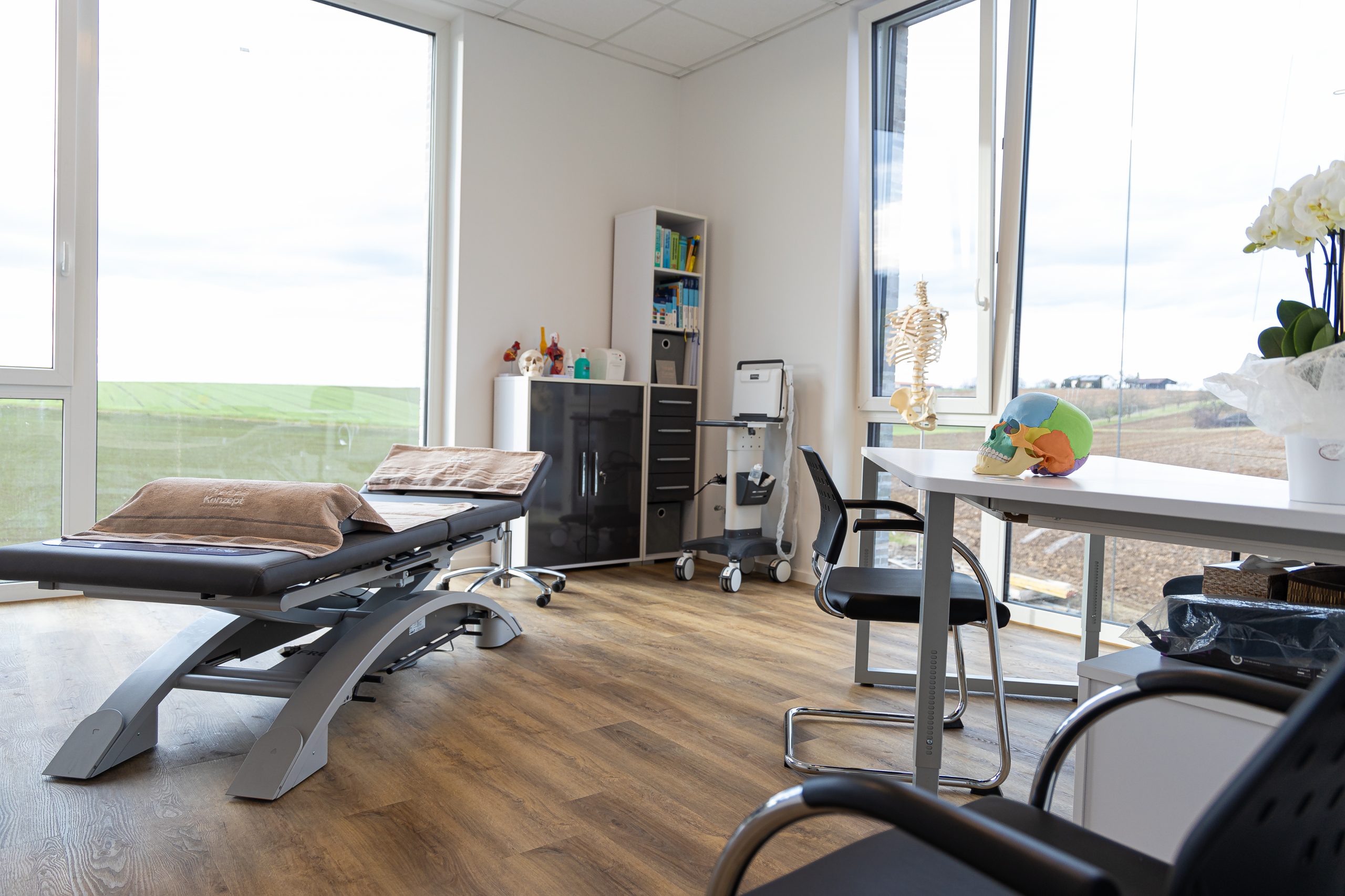 in einem modernen Neubaukomplex im ersten Stock mit einer Fläche von 345 Quadratmetern. Die Praxis umfasst sechs Behandlungsräume, einen speziellen Raum für Krankengymnastik am Gerät (KGG) und Medizinische Trainingstherapie (MTT), einen Aufenthaltsraum, und Patiententoiletten. Alle Mindestanforderungen für die Kassenzulassung sind erfüllt. Drei Ein- und Ausgänge sowie ein Aufzug im Gebäude gewährleisten einen barrierefreien Zugang zur Praxis.